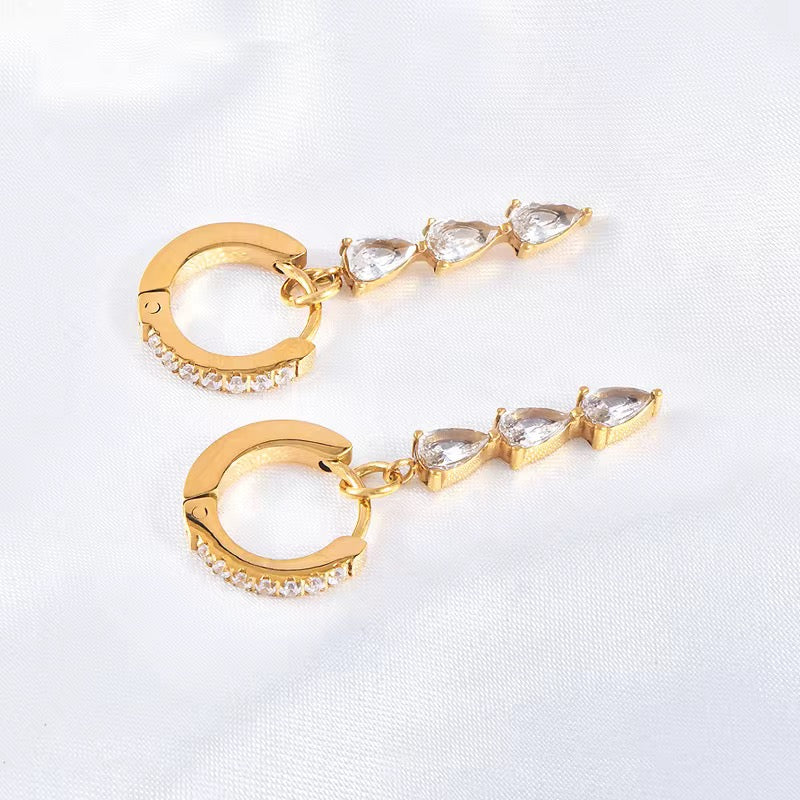 Make a stunning statement with the cascading brilliance of these long dangle hoops. They feature three brilliant-cut, graduated teardrop cubic zirconia stones that create beautiful movement and reflect maximum light.