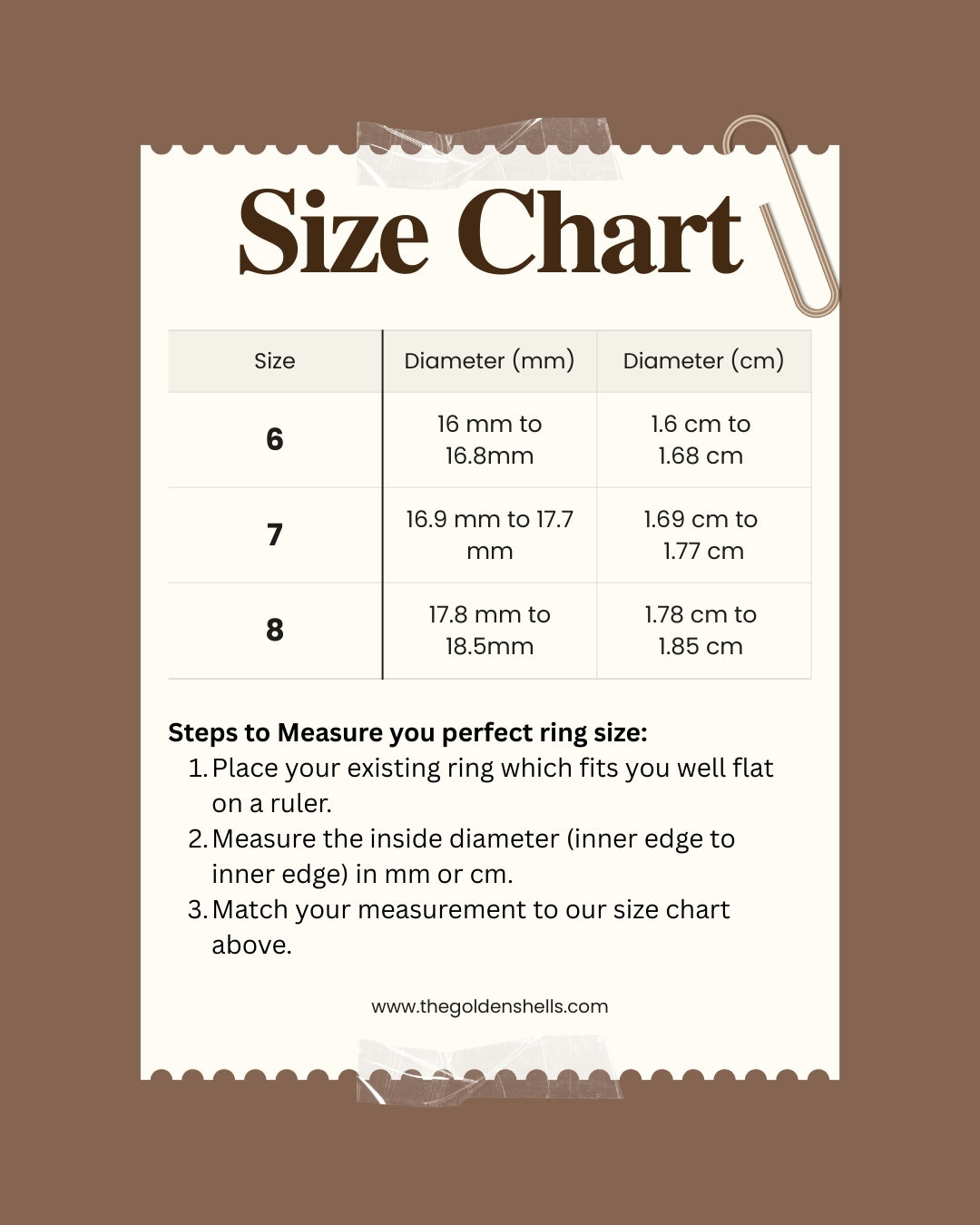 At Golden Shells, we want you to love your ring from the moment you slip it on. Follow our simple guide below to find your perfect size. We offer rings in sizes 6, 7, and 8 to fit most fingers beautifully.